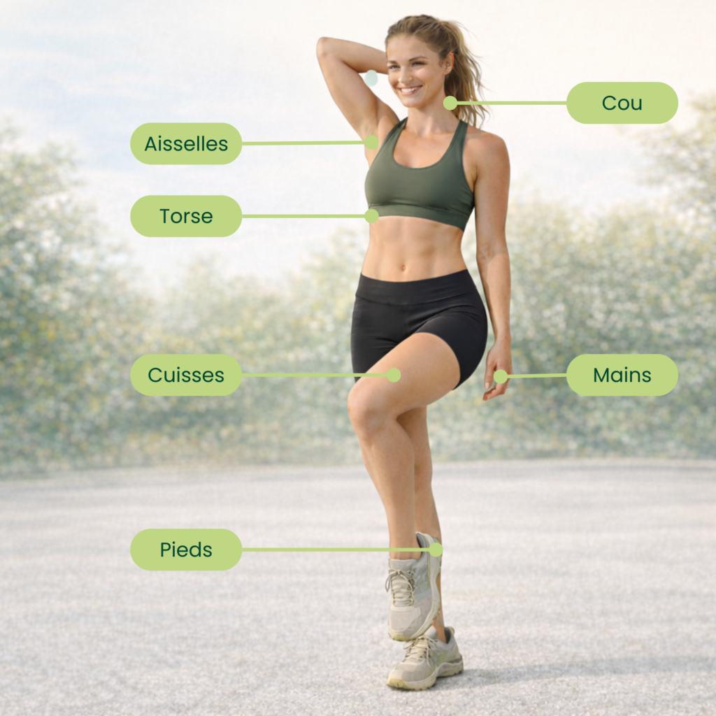 - Protège les zones sensibles (cuisses, pieds, aisselles, tétons, …)